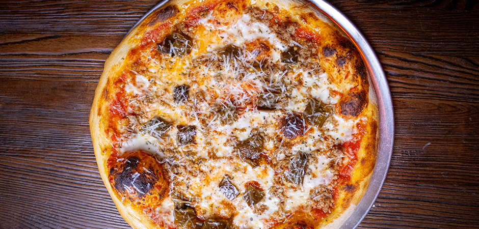 Spicy Italian sausage, long hot peppers, tomato sauce, house cheese blend, parmesan