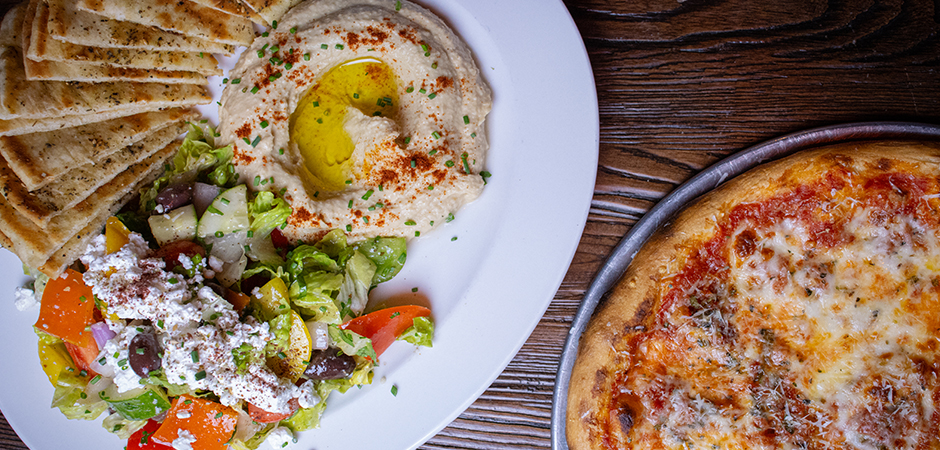 Grilled pita, romaine, house-made hummus, mixed olives, peppers, cucumbers, feta cheese, red wine-sumac vinaigrette • Add grilled herb chicken or grilled herb shrimp •