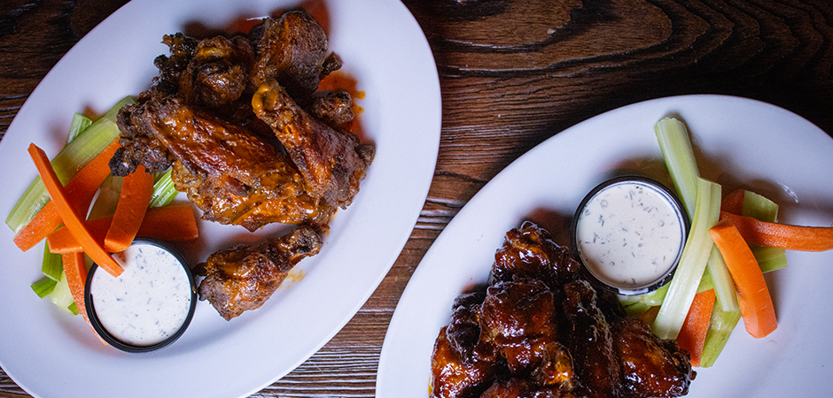 Choice of spicy bourbon barbeque, sweet soy ginger or buffalo sauce; served with ranch, carrots and celery